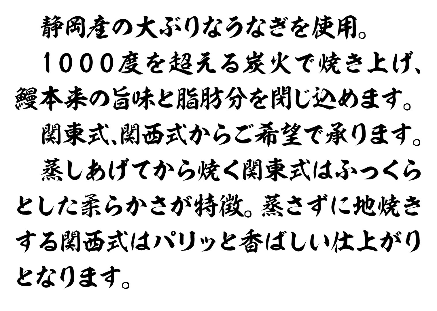 Menu お品書き 平日ランチ※前日までの注文のみ席予約可能、単品メニュー追加可能 鮭塩焼き定食 小鉢、香の物、ご飯、味噌汁付き 1,900 円 鯖塩焼き定食 小鉢、香の物、ご飯、味噌汁付き 1,900 円 かつをハラス定食 小鉢、香の物、ご飯、味噌汁付き 1,700 円 鯖味噌煮定食 小鉢、香の物、ご飯、味噌汁付き 1,800 円 銀鱈味噌漬けと刺身定食 小鉢、香の物、ご飯、味噌汁付き 3,500 円 天ぷら定食 小鉢、香の物、ご飯、味噌汁付き 2,400 円 ハラミステーキ定食 小鉢、香の物、ご飯、味噌汁付き 2,600 円 天丼定食(海老と野菜) 小鉢、香の物、ご飯、味噌汁付き 2,400 円 刺身定食※要予約 3,500 円 海鮮丼※要予約 3,500 円 おばら流 うなぎ料理※関東式と関西式を選べるものもあります。 鰻重(松)※関東式 肝吸い付き 6,500 円 鰻重(竹)※関東式 肝吸い付き 5,500 円 鰻重(梅)※関東式 3,500 円 鰻重(梅)と刺身定食※関東式 5,500 円 ひつまぶし※関西式 5,500 円 蒲焼定食※関東式、関西式(オススメ) 5,500 円 白焼き定食※関東式、関西式(オススメ) 5,500 円 まむし丼※関西式 ※ご飯の間に鰻がある丼 4,000 円 源平重※関東式、関西式(オススメ) ※蒲焼と白焼きのハーフ 6,500 円 源平焼き※関東式、関西式(オススメ) ※蒲焼と白焼きのハーフ 6,000 円 蒲焼※関東式、関西式(オススメ) 5,000 円 白焼き※関東式、関西式(オススメ) 5,000 円 白焼きスペシャル※関西式 5,200 円 お持ち帰りうな重(松)※関東式 6,500 円 お持ち帰りうな重(竹)※関東式 5,500 円 【鰻串】短尺 2本セット※数量限定 1,800 円 【鰻串】肝 2本セット※数量限定 1,000 円 【逸品】うざく 1,400 円 【逸品】う巻 2,500 円 【逸品】骨せんべい 800 円 【逸品】鰻天婦羅 1,500 円 刺身 サーモン 1,200 円 帆立 1,700 円 牡丹海老 1,800 円 ホッキ 1,600 円 蛸ブツ 1,300 円 盛り合わせ(1人前) 2,500 円 天婦羅 海老(3尾) 1,400 円 旬野菜 1,300 円 とうもろこしのかき揚げ 900 円 カマンベールチーズ 950 円 盛り合わせ(1人前) 2,500 円 炭火焼き※本日の熟成魚と季節の焼魚は店内にてご案内しています。 さば塩焼き 1,600 円 銀鱈味噌漬け 2,500 円 あおり烏賊一夜干し 2,000 円 鮭塩焼き 990 円 かつをハラス 1,000 円 サラダ 海鮮サラダ 1,200 円 シーザーサラダ 1,000 円 肉料理 馬刺し 2,300 円 桜ユッケ 2,300 円 伊達鶏唐揚げ 1,500 円 気仙沼ホルモン 1,500 円 伊達鶏串焼き2本(塩・タレ) 1,000 円 馬レバ刺 2,500 円 牛ハラミステーキ 2,500 円 川俣軍鶏手羽先 1,200 円 一品料理 自家製鮭の糀漬け 800 円 ニシン山椒漬け 850 円 地場野菜の糠漬け 800 円 もずく酢 700 円 三陸産カキフライ(3個) 1,300 円 牛すじトマト煮込み 1,500 円 海老真丈揚げ 900 円 自家製国産唐墨大根1枚 1,000 円 莫久来(ばくらい) ホヤとナマコの塩辛 1,200 円 鯖味噌煮 950 円 タコマリネ 900 円 塩辛 850 円 出汁玉子焼き 1,200 円 川海老唐揚げ 900 円 名代湯豆腐(秋冬) 900 円 食事 鮭茶漬け 1,400 円 南高梅茶漬け 1,000 円 馬刺し握り 2,500 円 おまかせ握り5貫 1,800 円 雑炊 1,200 円 バターしょうゆおにぎり2個 1,000 円 鍋料理※要予約※冬季限定11月頃~3月頃まで※日により材料が揃っている場合有。 セリ鍋(1人前) 3,500 円 カキ鍋(1人前) 3,800 円 寄せ鍋(1人前) 4,000 円 あんこう鍋(1人前) 3,800 円 すっぽん鍋(1人前) 4,200 円 国産牛すき焼き鍋(1人前) 4,800 円 国産牛しゃぶしゃぶ鍋(1人前) 4,800 円 ドリンク 【ビール】アサヒ プレミアム生ビール 熟撰 780 円 【ビール】サッポロ ラガービール 赤星(瓶) 850 円 【焼酎】銀座のすずめ(麦) 水割り・お湯割り・ロック・ストレート 670 円 【焼酎】吉四六(麦) 水割り・お湯割り・ロック・ストレート 700 円 【焼酎】佐藤(麦) 水割り・お湯割り・ロック・ストレート 700 円 【焼酎】百年の孤独(麦) 水割り・お湯割り・ロック・ストレート 1,200 円 【焼酎】富乃宝山(芋) 水割り・お湯割り・ロック・ストレート 670 円 【焼酎】佐藤黒(芋) 水割り・お湯割り・ロック・ストレート 800 円 【焼酎】魔王(芋) 水割り・お湯割り・ロック・ストレート 850 円 【焼酎】森伊蔵(芋) 水割り・お湯割り・ロック・ストレート 2,000 円 【サワー・酎ハイ・果実酒等】レモンサワー(無糖/加糖) 700 円 【サワー・酎ハイ・果実酒等】緑茶ハイ 700 円 【サワー・酎ハイ・果実酒等】ウーロンハイ 700 円 【サワー・酎ハイ・果実酒等】サントリー 角ハイ 780 円 【サワー・酎ハイ・果実酒等】翠ジンソーダ 700 円 【サワー・酎ハイ・果実酒等】スノードロップ レギュラー(ヨーグルト酒) 700 円 【サワー・酎ハイ・果実酒等】鳳凰美田 桃 700 円 【サワー・酎ハイ・果実酒等】山崎蒸溜所貯蔵梅酒(ウイスキーブレンド) 880 円 【ウイスキー】サントリー 角 濃いめはシングル×2のダブルにて提供 850 円 【ウイスキー】ニッカ 竹鶴 ピュアモルト 濃いめはシングル×2のダブルにて提供 1,500 円 【ウイスキー】サントリー 山崎 濃いめはシングル×2のダブルにて提供 1,700 円 【ウイスキー】サントリー 白州 濃いめはシングル×2のダブルにて提供 1,700 円 【ウイスキー】ニッカ シングルモルト 宮城狭 濃いめはシングル×2のダブルにて提供 1,300 円 