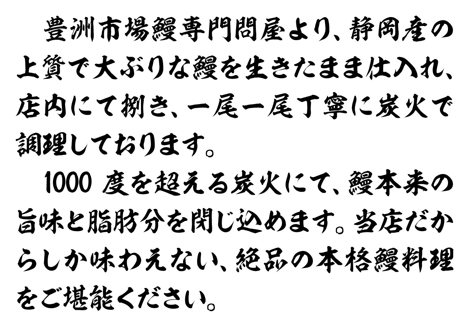 おばら流 うなぎ料理※関東式と関西式を選べるものもあります。 鰻重(松)※関東式 肝吸い付き 6,500 円 鰻重(竹)※関東式 肝吸い付き 5,500 円 鰻重(梅)※関東式 3,500 円 鰻重(梅)と刺身定食※関東式 5,500 円 ひつまぶし※関西式 5,500 円 蒲焼定食※関東式、関西式(オススメ) 5,500 円 白焼き定食※関東式、関西式(オススメ) 5,500 円 まむし丼※関西式 ※ご飯の間に鰻がある丼 4,000 円 源平重※関東式、関西式(オススメ) ※蒲焼と白焼きのハーフ 6,500 円 源平焼き※関東式、関西式(オススメ) ※蒲焼と白焼きのハーフ 6,000 円 蒲焼※関東式、関西式(オススメ) 5,000 円 白焼き※関東式、関西式(オススメ) 5,000 円 白焼きスペシャル※関西式 5,200 円 お持ち帰りうな重(松)※関東式 6,500 円 お持ち帰りうな重(竹)※関東式 5,500 円 【鰻串】短尺 2本セット※数量限定 1,800 円 【鰻串】肝 2本セット※数量限定 1,000 円 【逸品】うざく 1,400 円 【逸品】う巻 2,500 円 【逸品】骨せんべい 800 円 【逸品】鰻天婦羅 1,500 円 鍋料理※要予約※冬季限定は11月頃~3月頃まで※日により材料が揃っている場合有。 セリ鍋(1人前) ※冬季限定 4,000 円 カキ鍋(1人前) ※冬季限定 4,200 円 寄せ鍋(1人前) ※冬季限定 4,400 円 あんこう鍋(1人前) ※冬季限定 4,800 円 すっぽん鍋(1人前) ※通年 5,500 円 すき焼き鍋(近江牛150g)(1人前) ※通年 7,700 円 しゃぶしゃぶ鍋(近江牛150g)(1人前) ※通年 7,700 円 刺身 サーモン 1,200 円 帆立 1,700 円 牡丹海老 1,800 円 ホッキ 1,600 円 蛸ブツ 1,300 円 盛り合わせ(1人前) 2,500 円 天婦羅 海老(3尾) 1,400 円 旬野菜 1,300 円 とうもろこしのかき揚げ 900 円 カマンベールチーズ 950 円 盛り合わせ(1人前) 2,500 円 焼魚 さば塩焼き 1,600 円 銀鱈味噌漬け 2,500 円 鮭塩焼き 990 円 かつをハラス 1,000 円 肉料理 馬刺し 2,300 円 桜ユッケ 2,300 円 伊達鶏唐揚げ 1,500 円 気仙沼ホルモン 1,500 円 伊達鶏串焼き2本(塩・タレ) 1,000 円 馬レバ刺 2,500 円 牛ハラミステーキ 2,500 円 川俣軍鶏手羽先 1,200 円 牛すじトマト煮込み 1,500 円 一品料理 自家製鮭の糀漬け 800 円 ニシン山椒漬け 850 円 地場野菜の糠漬け 800 円 もずく酢 700 円 祖父江銀杏塩煎り 1,100 円 川海老唐揚げ 900 円 自家製国産唐墨大根1枚 1,000 円 莫久来(ばくらい) ホヤとナマコの塩辛 1,200 円 鯖味噌煮 950 円 タコマリネ 900 円 塩辛 850 円 出汁玉子焼き 1,200 円 海老真丈揚げ 900 円 名代湯豆腐(秋冬) 900 円 サラダ 海鮮サラダ 1,200 円 シーザーサラダ 1,000 円 食事 鮭茶漬け 1,400 円 南高梅茶漬け 1,000 円 馬刺し握り 2,500 円 おまかせ握り5貫 1,800 円 雑炊 1,200 円 バターしょうゆおにぎり2個 1,000 円 ドリンク 【ビール】アサヒ プレミアム生ビール 熟撰 780 円 【ビール】サッポロ ラガービール 赤星(瓶) 850 円 【焼酎】銀座のすずめ(麦) 水割り・お湯割り・ロック・ストレート 670 円 【焼酎】吉四六(麦) 水割り・お湯割り・ロック・ストレート 700 円 【焼酎】百年の孤独(麦) 水割り・お湯割り・ロック・ストレート 1,200 円 【焼酎】佐藤黒(芋) 水割り・お湯割り・ロック・ストレート 800 円 【焼酎】魔王(芋) 水割り・お湯割り・ロック・ストレート 850 円 【焼酎】森伊蔵(芋) 水割り・お湯割り・ロック・ストレート 2,000 円 【サワー・酎ハイ・果実酒等】レモンサワー(無糖/加糖) 700 円 【サワー・酎ハイ・果実酒等】緑茶ハイ 700 円 【サワー・酎ハイ・果実酒等】ウーロンハイ 700 円 【サワー・酎ハイ・果実酒等】サントリー 角ハイ 780 円 【サワー・酎ハイ・果実酒等】翠ジンソーダ 700 円 【サワー・酎ハイ・果実酒等】スノードロップ レギュラー(ヨーグルト酒) 700 円 【サワー・酎ハイ・果実酒等】鶴姫 柚子 700 円 【サワー・酎ハイ・果実酒等】山崎蒸溜所貯蔵梅酒(ウイスキーブレンド) 880 円 【ウイスキー】サントリー 角 濃いめはシングル×2のダブルにて提供 850 円 【ウイスキー】ニッカ 竹鶴 ピュアモルト 濃いめはシングル×2のダブルにて提供 1,500 円 【ウイスキー】サントリー 山崎 濃いめはシングル×2のダブルにて提供 1,700 円 【ウイスキー】サントリー 白州 濃いめはシングル×2のダブルにて提供 1,700 円 【ウイスキー】ニッカ シングルモルト 宮城狭 濃いめはシングル×2のダブルにて提供 1,300 円 【ウイスキー】ニッカ シングルモルト 余市 濃いめはシングル×2のダブルにて提供 1,300 円 【ウイスキー】サントリー 山崎12年 濃いめはシングル×2のダブルにて提供 3,000 円 【ウイスキー】サントリー 響 blender’s choice 濃いめはシングル×2のダブルにて提供 2,000 円 【ウイスキー】サントリー 響17年 濃いめはシングル×2のダブルにて提供 7,000 円 【ウイスキー】イチローズモルト&グレーンホワイトラベル 濃いめはシングル×2のダブルにて提供 1,500 円 【ウイスキー】マッカラン18年シェリーオークカスク2021 濃いめはシングル×2のダブルにて提供 7,000 円 【ウイスキー】シーバスリーガル ミズナラ 18年 カスクフィニッシュ 濃いめはシングル×2のダブルにて提供 2,000 円 【ウイスキー】嘉之助 シングルモルト 濃いめはシングル×2のダブルにて提供 2,000 円 【ウイ